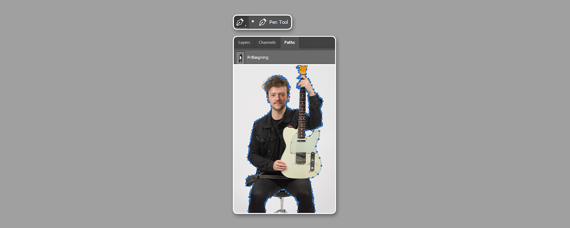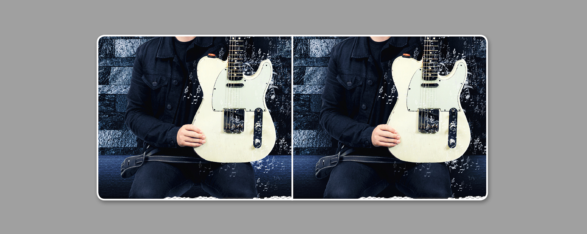 Nodeeffekten omkring guitaren samt den kolde billedstil, er skabt med en selvlavet action. Med 2 forskellige lag, males der på karakteren og guitaren. Action’en vil arbejde med paths for at anvende brushes, lagene navngives unikt og tonen skabes med gradientmaps og div. adjustment layers.
