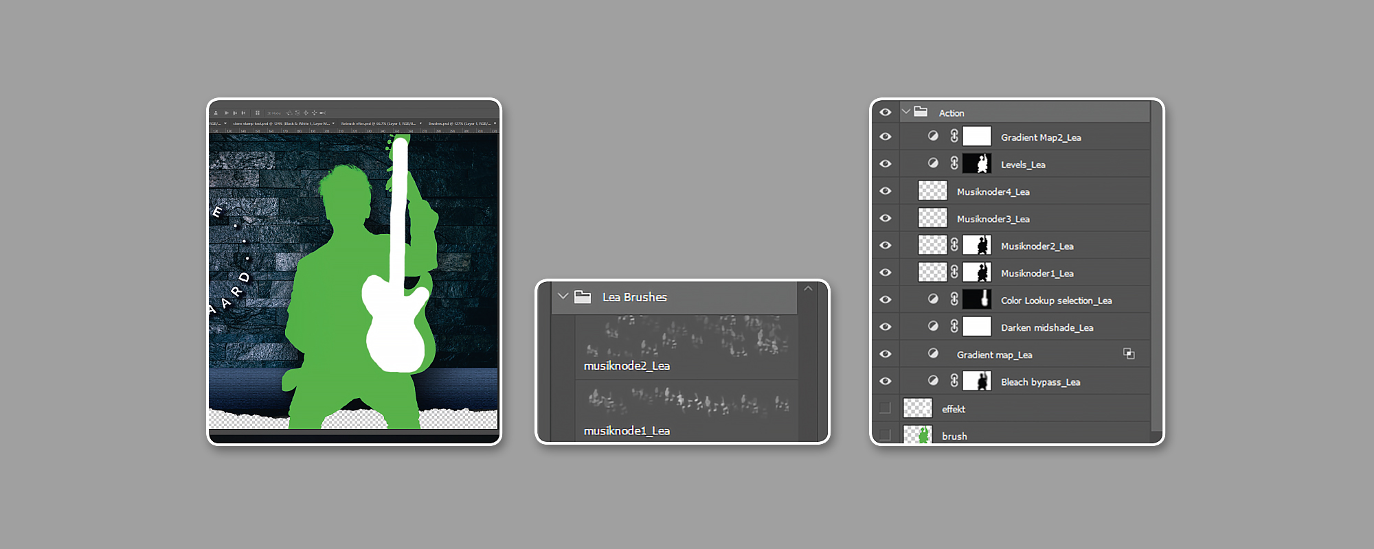 Nodeeffekten omkring guitaren samt den kolde billedstil, er skabt med en selvlavet action. Med 2 forskellige lag, males der på karakteren og guitaren. Action’en vil arbejde med paths for at anvende brushes, lagene navngives unikt og tonen skabes med gradientmaps og div. adjustment layers.