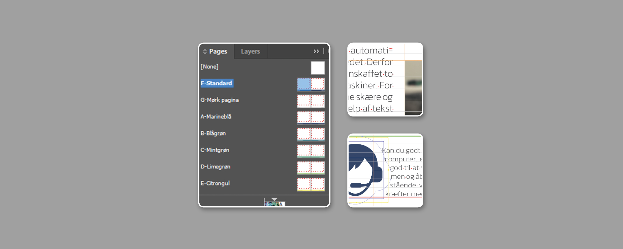 Masterpages, lænkede text frames, div. styles (object, character, paragraph), figursats, bibliotek og preflight er nogle af de rationelle metoder jeg har anvendt til produktet.