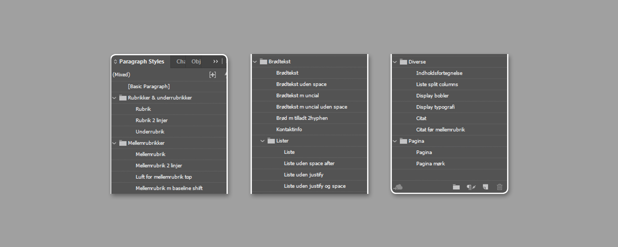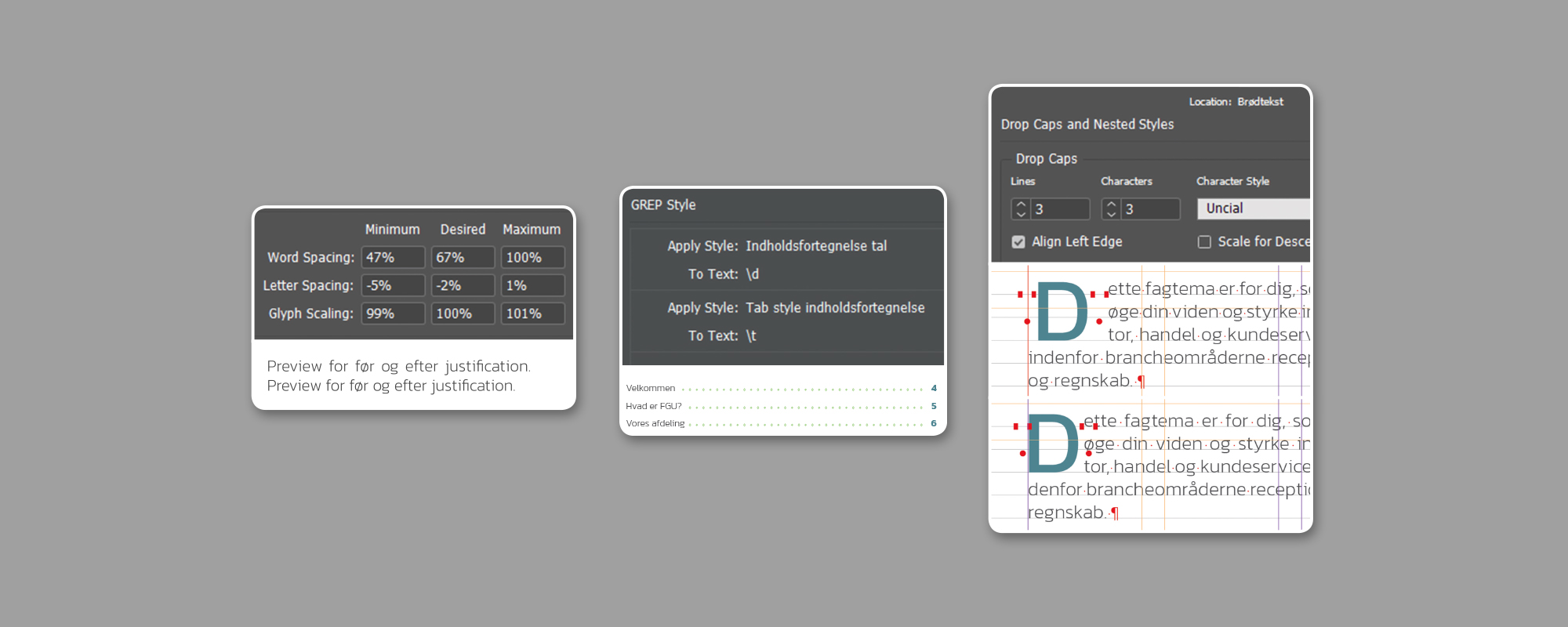 Justification samt keep options til brødtekst, GREP styles til indholdsfortegnelse og nested styles til uncialer med hairspaces er nogle af de indstillinger der ses i mine paragraph styles. Alle styles er med manuelt udregnet grid-align.