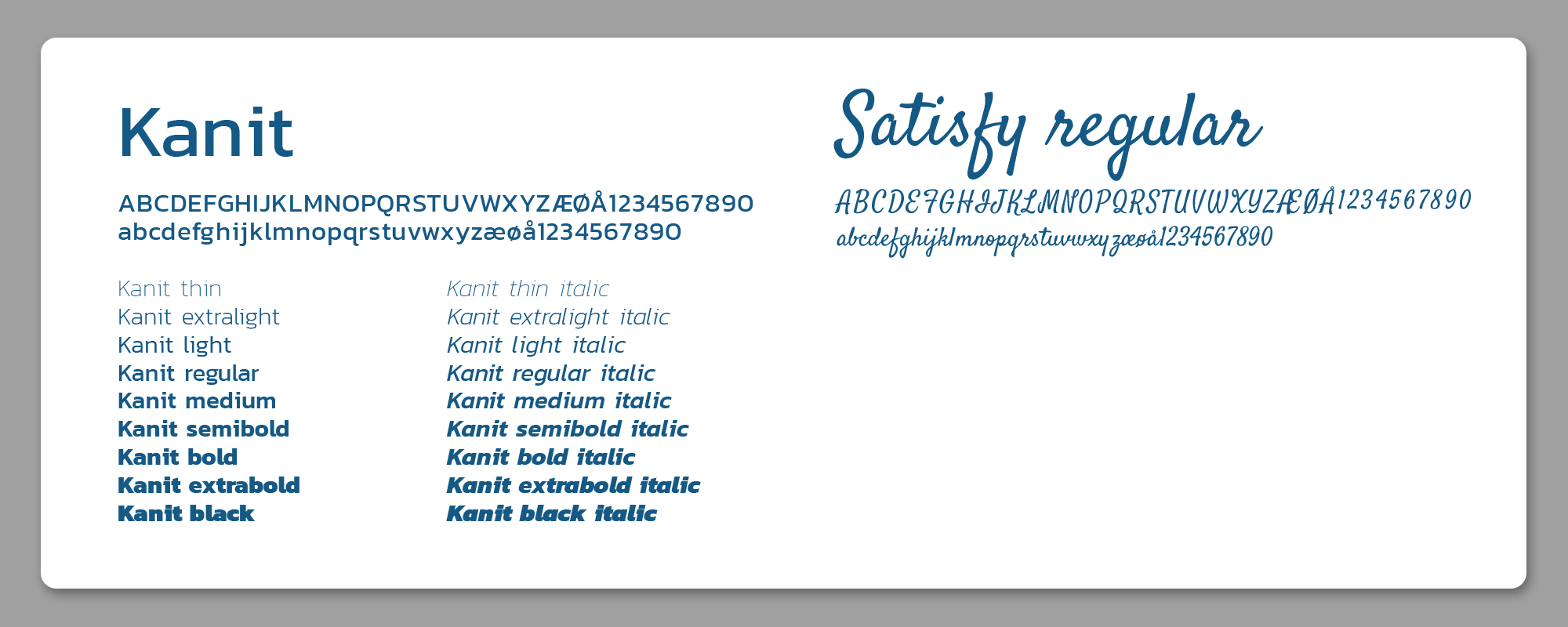 Satisfy er en moderne script typeface, også en Google Font. Den harmonerer godt med Kanit, og er anvendt til display typografi.